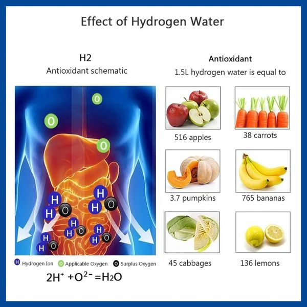 Hydrogen has a selective antioxidant and has a strong ability to restore the human body to thinking activities such as physical and mental. Hydrogen (H2) binds with the reactive oxygen (O-2) in the human body causing adsorption of water (H2O) discharge.