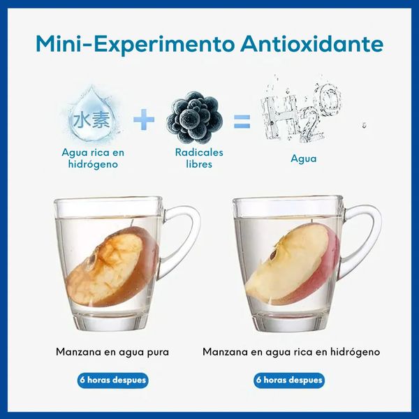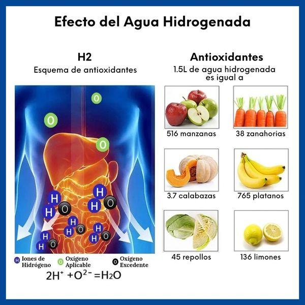 El hidrógeno tiene un antioxidante selectivo y tiene una gran capacidad para restaurar el cuerpo humano en todo tipo de actividad, tanto física y mental. El hidrógeno (H2) se une con el oxígeno reactivo (O-2) en el cuerpo humano provocando la adsorción de la descarga de agua (H2O).
